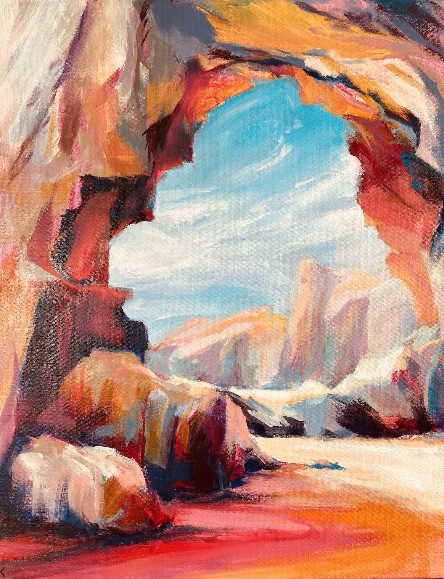 Striking view inspired by the cavern at Lydstep, Pembrokeshire. Full of intense colour creating a portal view. The picture just makes me want to step through into the light to make more discoveries!